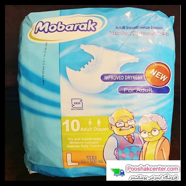 خرید آنلاین پوشک بزرگسالان چسبی مبارک با کیفیت مناسب و ساخت کشور ایران می باشد پوشینه بزرگسالان مبارک لارج مناسب برای دور کمر 100 تا 150 سانتی متر می باشد ، پوشک بزرگسال مبارک با قدرت جذب مناسب می باشد .